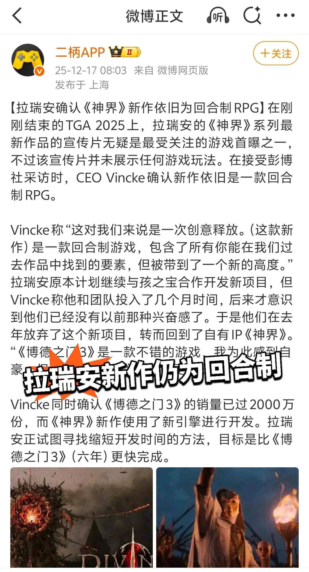 曾产出过年度游戏《博德之门3》的拉瑞安工作室CEO,在近日接受采访时正式确认,在TGA上公布的《神界》系列新作将依然采用玩家熟悉的回合制战斗玩法消息一出,社区讨论热烈,相关话题引发玩家热议。据悉新作采用新引擎制作,玩法延续回合制,在自己熟悉的领域耕耘,可以降低翻车风险,感觉拉瑞安这波操作很稳期待新作能延续《博德之门3》的高水准 #主机单机 #游戏资讯 #博德之门3 #神界新作仍将采用回合