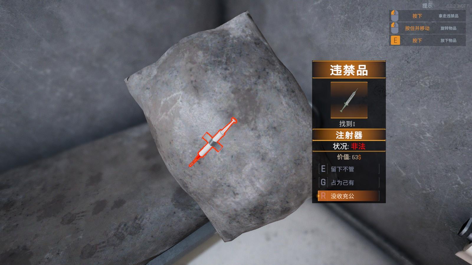 玩家扮演的狱警在每日的巡查和工作中,会定期搜索牢房,便可能搜查出一些犯人们私藏的小物件——可能是一些小零食,也可能是一些违禁品,比如注射器,烟蒂和药品等。这时候玩家有三个选择:不做处理、私自留下和扣押充公。如果选择私自留下,则会降低犯人好感度;选择充公,则可能会触发犯人的恳求,归还物品并且增加犯人好感度或者选择拒绝减少犯人好感度并且增加狱警好感度,好感度会影响着后续突发事件中狱警和犯人对你的一些小动作的容忍程度。