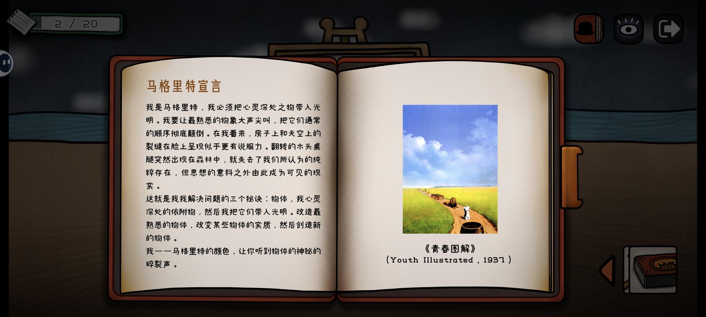 游戏是把艺术和解谜结合起来,感觉很吸引我的设计就是硬币和书(放p2了,不知道这个设计叫什么),反正就是有对艺术家艺术著作的介绍,感觉挺不错关于艺术部分,我没怎么接触过艺术,不太懂,就感觉试玩部分讲的艺术就挺哲学的,也许艺术就和哲学是息息相关的?(不懂瞎说的
