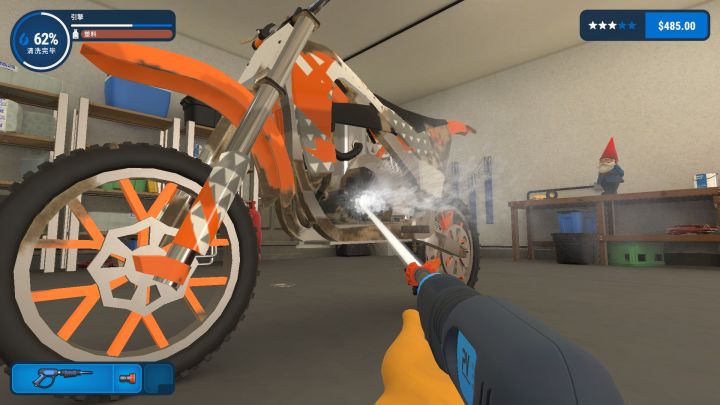 这款游戏的核心玩法是如此简单,以至于玩家在第一次进入游戏后就直接干活儿了,并没有新手引导的教程。玩家进入游戏后就要开始自己的工作了,第一份工作是清洗一辆车。按住左键就可以让高压水枪喷出水,但松开左键就会停止喷水,而按下右键可以让高压水枪持续喷水,因此在清洗过程中可以先用右键来洗一个大概,边角旮旯处有残留污垢的时候适合用左键来“查缺补漏”。