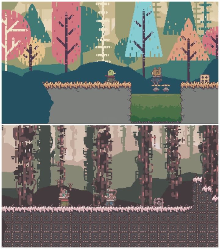 前期过几个平平无奇的推箱子关卡后,本作的精髓也是最大的创意就展开了,在两个小男孩在路边发现一具已经腐朽的死鹿时,两个玩家会彻底看到不一样的世界,此时再进行闯关就要跟朋友实打实地有效沟通,玩家会从看到的人物不一样,场景不一样,慢慢变成道具不一样,地形也不一样,越玩越精神错乱,两个世界的差异越来越大,沟通是通关的唯一办法,玩法十分新奇有趣,也特别考验朋友之间的默契程度。