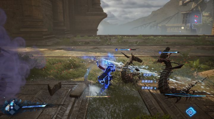 后面我重新看了一遍教程发现,这游戏连按两下L1可以直接从空中重置位置到地面,然后我就开始打了第一套单手剑胎教滞空连招:先轻重挑空然后长按轻攻击开始闪,然后连按L1落地之后再轻重挑空循环。对付没有韧条的和空韧条的小型和人形怪物,就是用最简单的操作打出最持久的浮空。