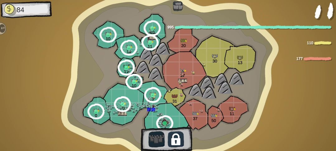 每个地区第一次占有几个金币,我用的19关,刷完等半分就50左右金了。 点个指挥,全选城池就可以开始啦。 刷金后优先点防御,暴击,初始也有点用10个就够了,其次速度。然后你就可以把所有的升满了还有好多金……