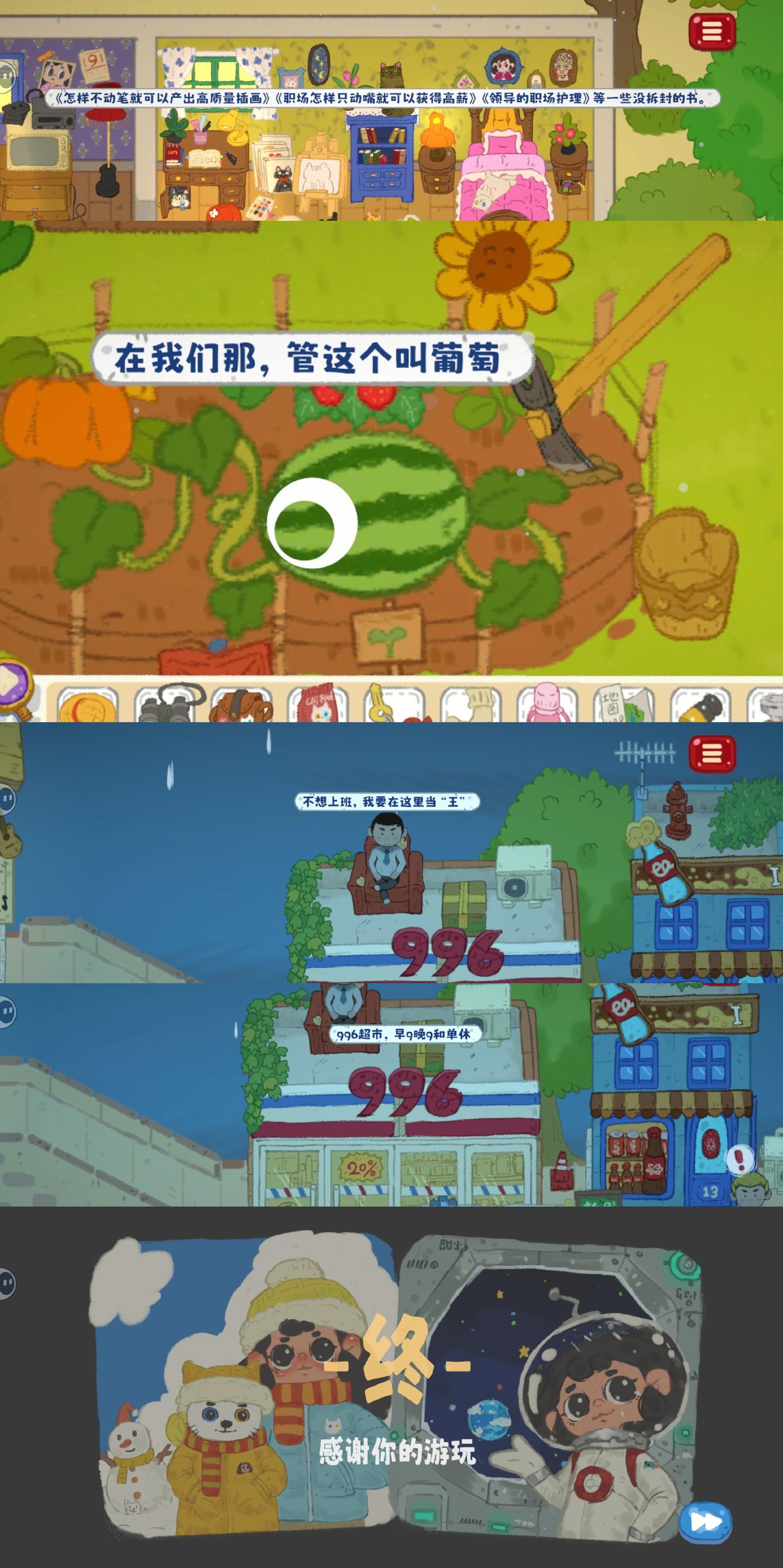 可玩性很强!!没有什么特别难的地方,就是需要多花一点时间,而且点击人物或者点击实物的时候会出现一些很可爱的话,特别喜欢这种彩蛋的感觉,很好玩很好玩