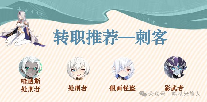 转载自公众号@哈基米旅人,感谢大佬产出优质攻略,家人们给大佬点点关注呀 ————————我是分割线——————— 本期来谈一谈刺客和法师职业各个角色转职推荐。 刺客 处刑者:提高连续收割能力,每次击杀增加攻击力和爆伤,在神话暴击魔物出来后多数情况下都比假面怪盗更优。 假面怪盗:释放奥义增加暴击,目前已不太适合版本,开服一个月后不兑换神话暴击魔物的小伙伴们可以考虑转职假面怪盗来补充暴击。 影武