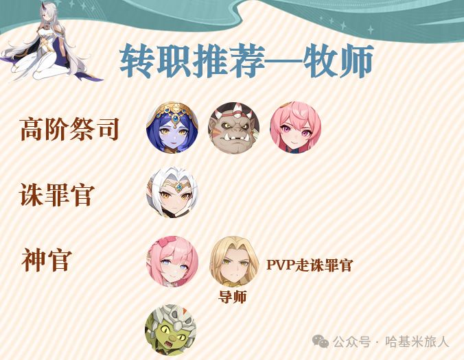 转载自公众号@哈基米旅人,感谢大佬产出优质攻略,家人们给大佬点点关注呀 ————————我是分割线——————— 本期来谈一谈牧师和坦克职业各个角色转职推荐。 牧师 高阶祭司:提高队伍的奥义点回复速度。牧师的万金油转职,通用性强,前置职业是祭司的情况下效果更佳。但需要注意的是队伍中带两个高阶祭司时效果不能叠加。 诛罪官:降低对方奥义点回复速度,偏pvp。配合黑龙阵营的效果,6v6中对方基本没法开