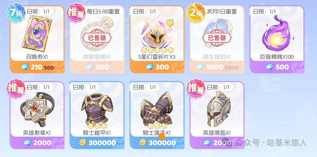转载自公众号@哈基米旅人,感谢大佬产出优质攻略,家人们给大佬点点关注[表情_开心] ————————我是分割线———————— 神秘商店 推荐购买每日探险指南(开服第一天没有)和每月的源生琥珀(囤着先) 开服前几天实在缺龙魂可以用钻石买龙魂,但不推荐7折普抽 竞技商店 前期优先兑换竞技场高排名奖励(不需要都换,通常排名越高性价比越高) 优先保证每个月的7折神话召唤券 游戏初期推荐兑换埃及艳后