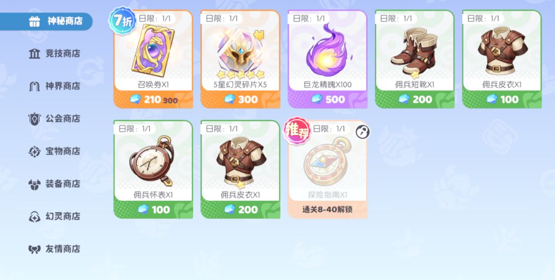 由于商店可购买或兑换的种类繁多,这篇攻略将帮大家整理初期现有的商店兑换项目,以及个人推荐的商品兑换优先顺序~ (每个人需求不同,所以不一定要完全参考我的版本,大家可根据实际情况调整。) 随着主线推图进度的推进,各商店会逐步开放新的兑换内容。 以下根据封测期间的进度加上OB后的实际情况,整理出开服初期可以解锁的商店内容: 第一天推图至第六章结束时,商店会解锁前 7 个项目;到开服第三天,解锁“冠军讨
