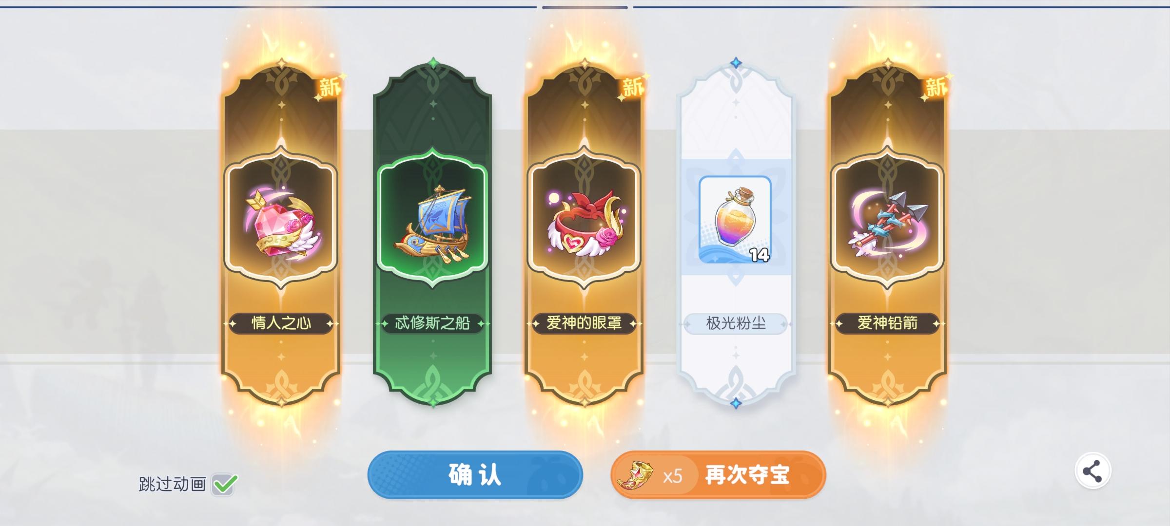 居然还有这种操作,40抽齐了,第一轮用的普通号角,现在比较尴尬的是只有红号角了,丘比特是传说宝物,还有必要继续投入拿金叶子吗