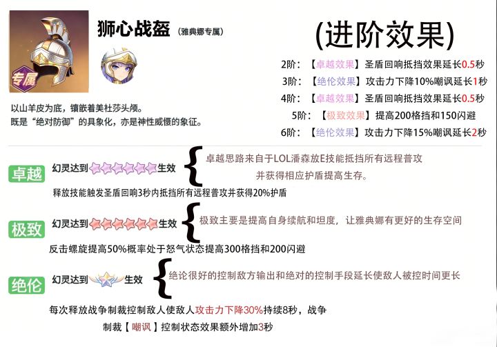 宝具名称:「枭眼战盔·珀拉斯」(“珀拉斯”源自雅典娜别名“帕拉斯·雅典娜”,“枭眼”呼应她的象征——智慧猫头鹰)卓越技能效果佩戴时,雅典娜获得「枭之洞察」效果:攻击命中敌方单位后,会为目标附加1层“破妄”标记(最多叠加3层),每层标记降低目标10%防御,持续3秒。同时自身获得5%的暴击率加成,持续至战斗结束。极致技能效果「枭之洞察」效果强化:每层“破妄”标记提升至降低15%防御,且标记持