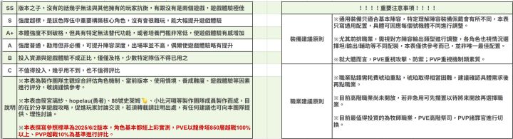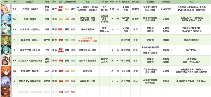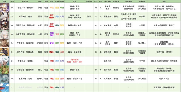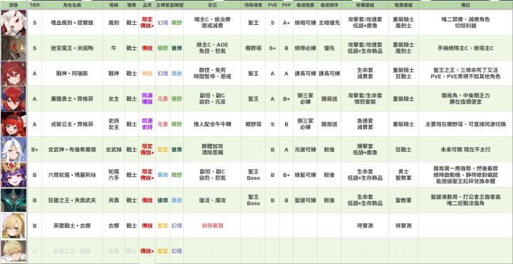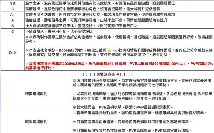 本篇指南以台服《龍魂旅人》6月2日版本為基準,對應大約開服五個月後的遊戲進度。所有角色皆以上彩鑽強度實測為主,PVE部分以龍骨越戰100%以上,PVP越戰10%以上為標準,對戰表現進行綜合評估。開局開荒階段,由於包含龍語、魔物、神器等多項機制尚未完全開放,使用上可能會有落差,請多留意。但由於開荒期轉瞬即逝,角色養成更需著眼長遠,不建議因短期過度需求而投資養錯角色、甚至資源砸入後期難以使用的角色。