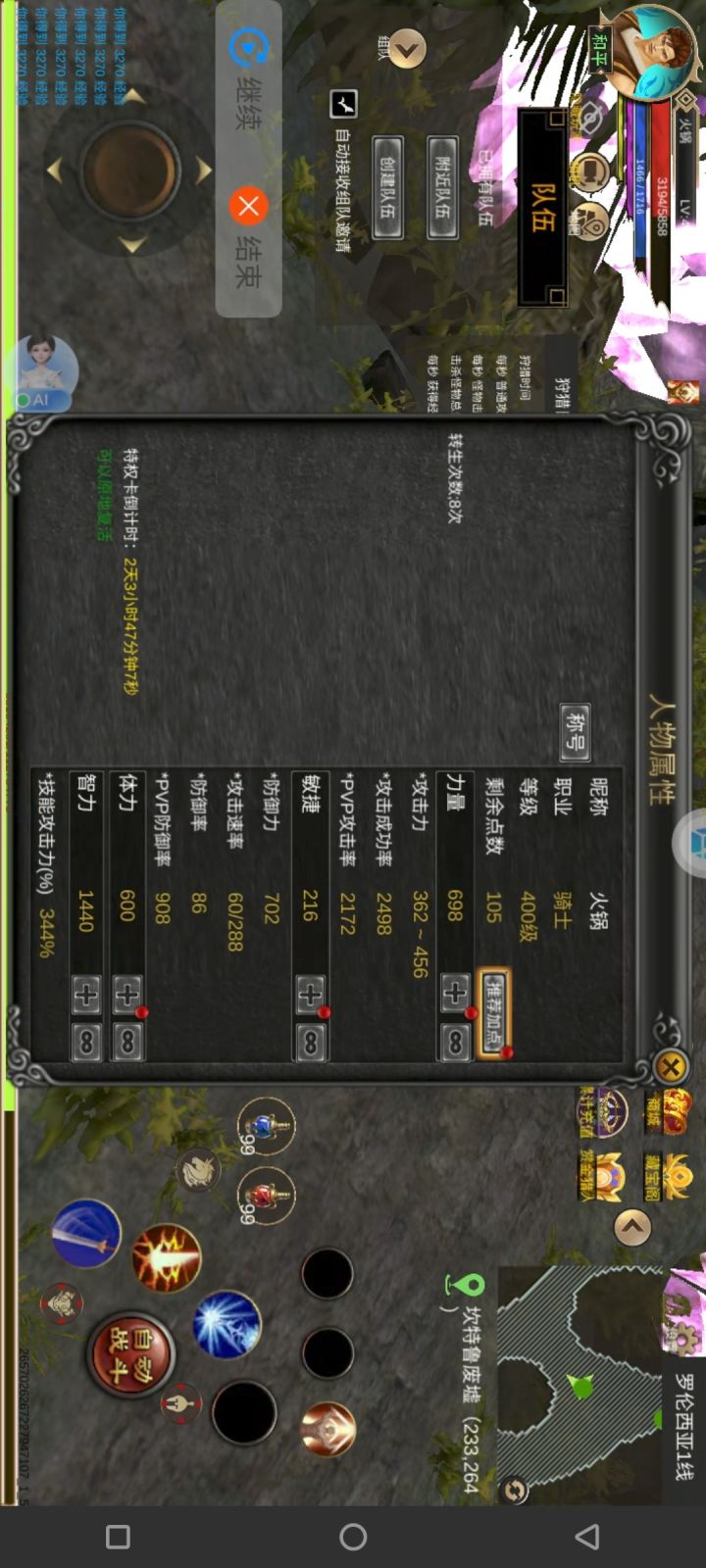 来到进阶阶段(8转以上),想必各位已经大概懂得战士该怎么玩了。加点方面参考我的这个战士小号,力敏只到能穿装备,1:2的体力智力,基本可以达到坎三挂机了。之后可以考虑提升敏捷。(当然也可以主敏捷,1:1的体力智力,伤害略低但是攻速回避高)练级方面图3图4这两个点都是前中期最优点(坎三),不打宝石的情况下这里可以挂机到40-50转。钻石方面各位都到8转了