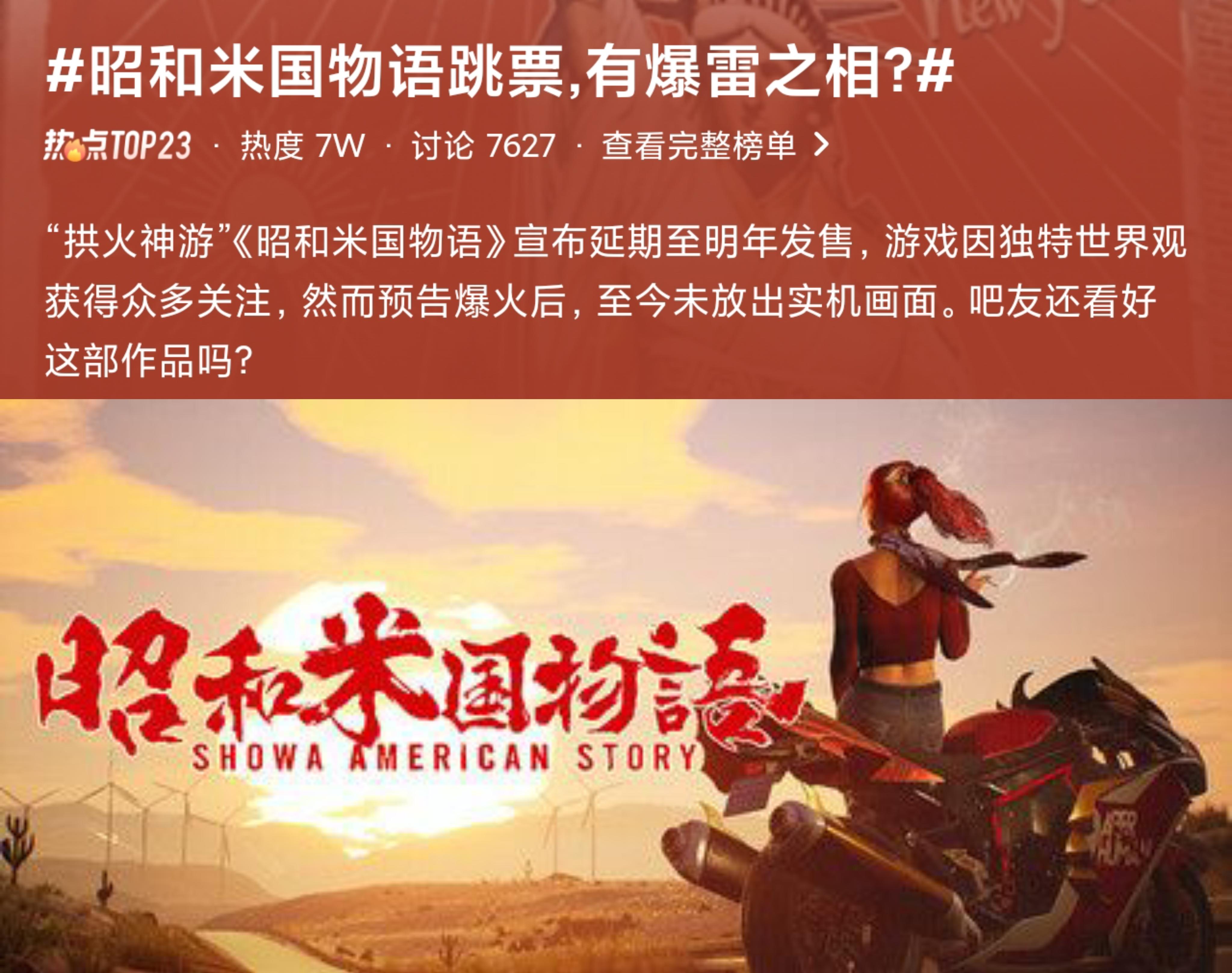 📅延期公告曾以文化杂糅的预告而爆火的《昭和米国物语》已于近日宣布作品将延期至2026年发售原因系【随着开发进入最终打磨阶段,为了不留遗憾地把作品呈现在玩家面前,经过再三思考后决定调整发售计划】信息一经发布,引发大量玩家关注相关信息,也在短时间内登上各平台的热搜榜单❤制作人致歉游戏首席制作人对此表示歉意【我知道这并非你们所期待的消息,对此我感到很抱歉。但这段多出来的时间,将让《昭
