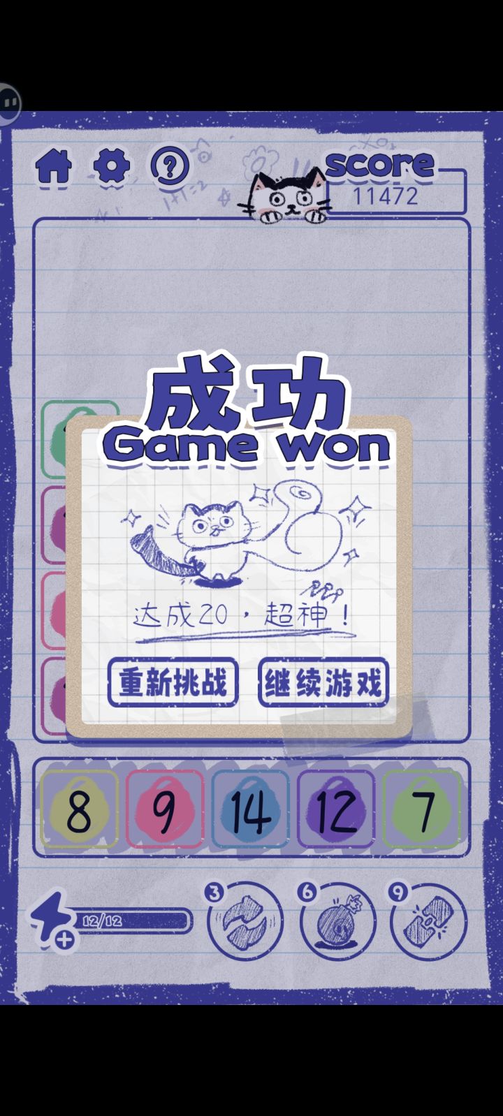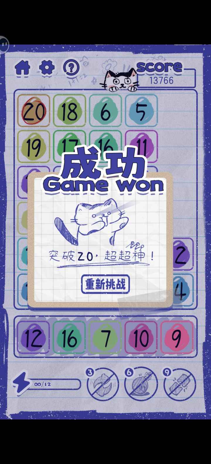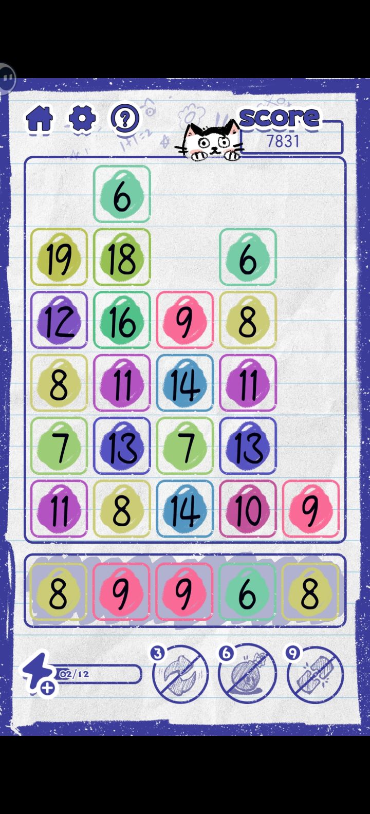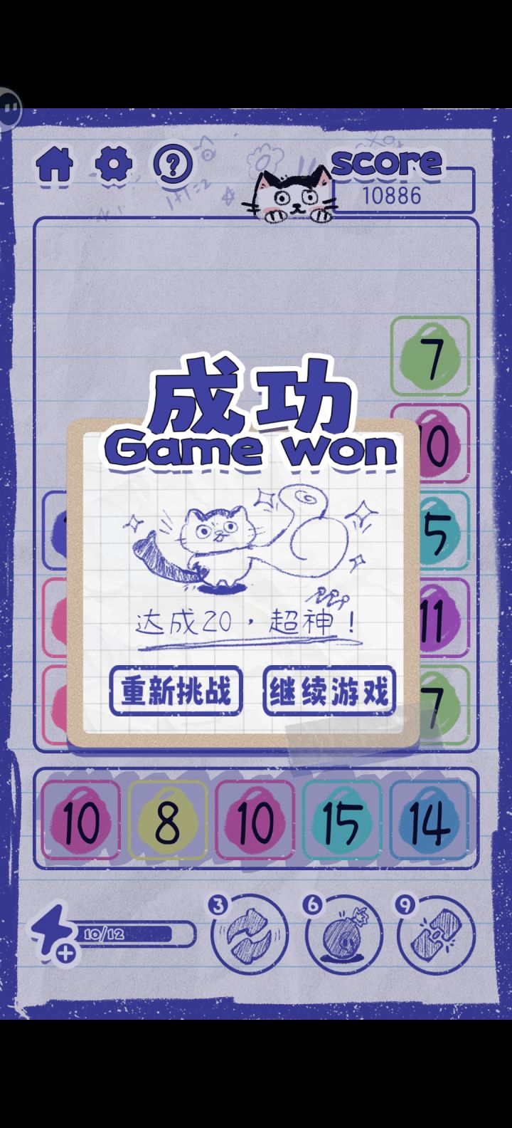 2D美术效果很像在纸上做涂鸦,背景直接就是一张纸,不同数字带有底色,区别很明显。界面结构简单,UI品质较好,像个人作品。消除与合并都有简单的特效,意思表达准确。