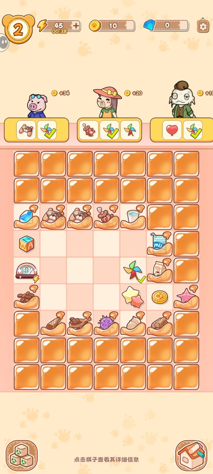消除是很常规的二合一规则,最初的种类比较少,随着开启格子越多,种类逐渐丰富。资源产出物品除了体力限制,也有CD时间,设定基本一致。同样有仓库功能,可以存储一些暂时不用的元素。