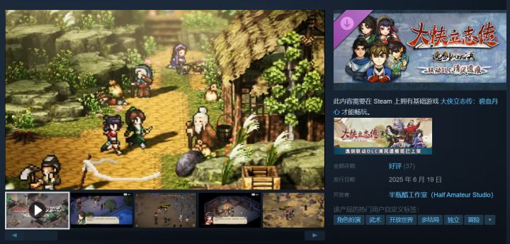 听到是联动DLC并且是免费的!很难不激动了家人们~游戏:大侠立志传平台:steam【清风遗痕】DLC内容《清风遗痕》是《大侠立志传》首个联动拓展包,将迎来3名《逸剑风云决》的人气角色:上官虹、司马铃和宇文逸。在保留了原作英雄的功法和绝招基础上,拓展了双方的主线故事,新增角色支線、4名关键剧情角色、新地图等。《清风遗痕》承接了玩家成为英雄会冠军的故事,包含一条完整的联动剧情线,逸剑人气角