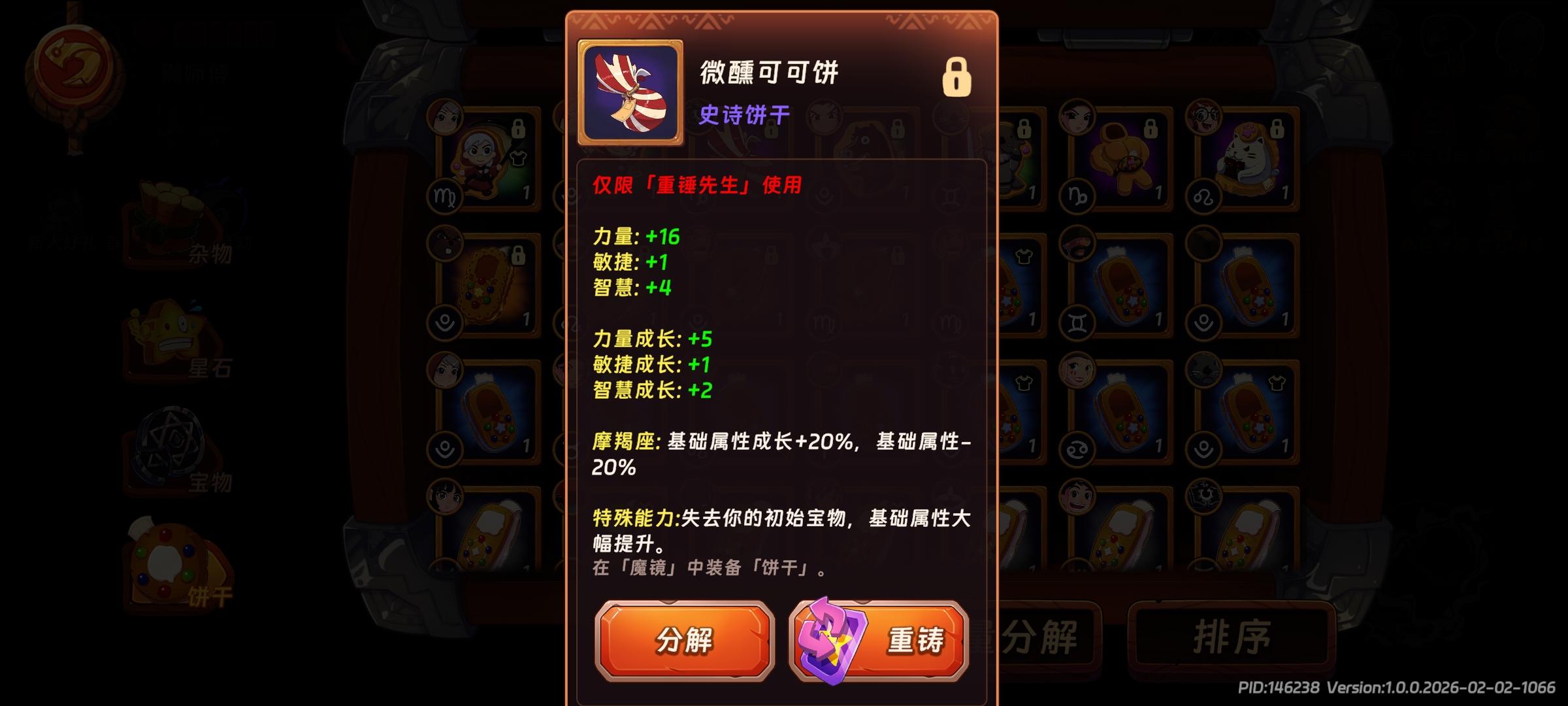 (1)所有获得的饼干不要分解,不管是白色、蓝色、还是橙色都留着到烘焙坊里换史诗/奇幻饼干。分解只有一点毛毛雨亏到炸裂,商店里每天刷新的史诗饼干随便一点垃圾饼干只要星座对的上就能换(星座可以用饼干重铸石重铸),套娃一下,再拿史诗饼干换奇幻饼干,绝对比分解出一点点垃圾赚。(2)存钱功能在你打完boss以后下一个房间的传送门附近↓一局游戏最多存200金币(3)少买点宝物任选卡,宝物多重复刷1-1的大