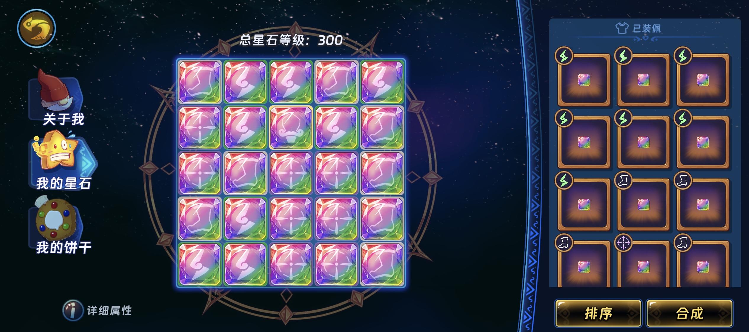 1.星石获取非常肝,需要不断进冒险存钱,然后出来抽。(打完boss后会进入神秘小屋,小屋绿色传送门右边有个保险柜,过去交互一下就能存钱了 ,一次最高200,也就是两抽)2.星石每次合成都会减少一格,仅剩一格时合成将提升品质。白4-白3-白2-白1-蓝4依次类推3.星石最高12级,也就是橙1(彩1),品质白-蓝-橙(彩)4.每一次品质提升(变色)会新增一条随机词条,原有词条不变5.所有词条