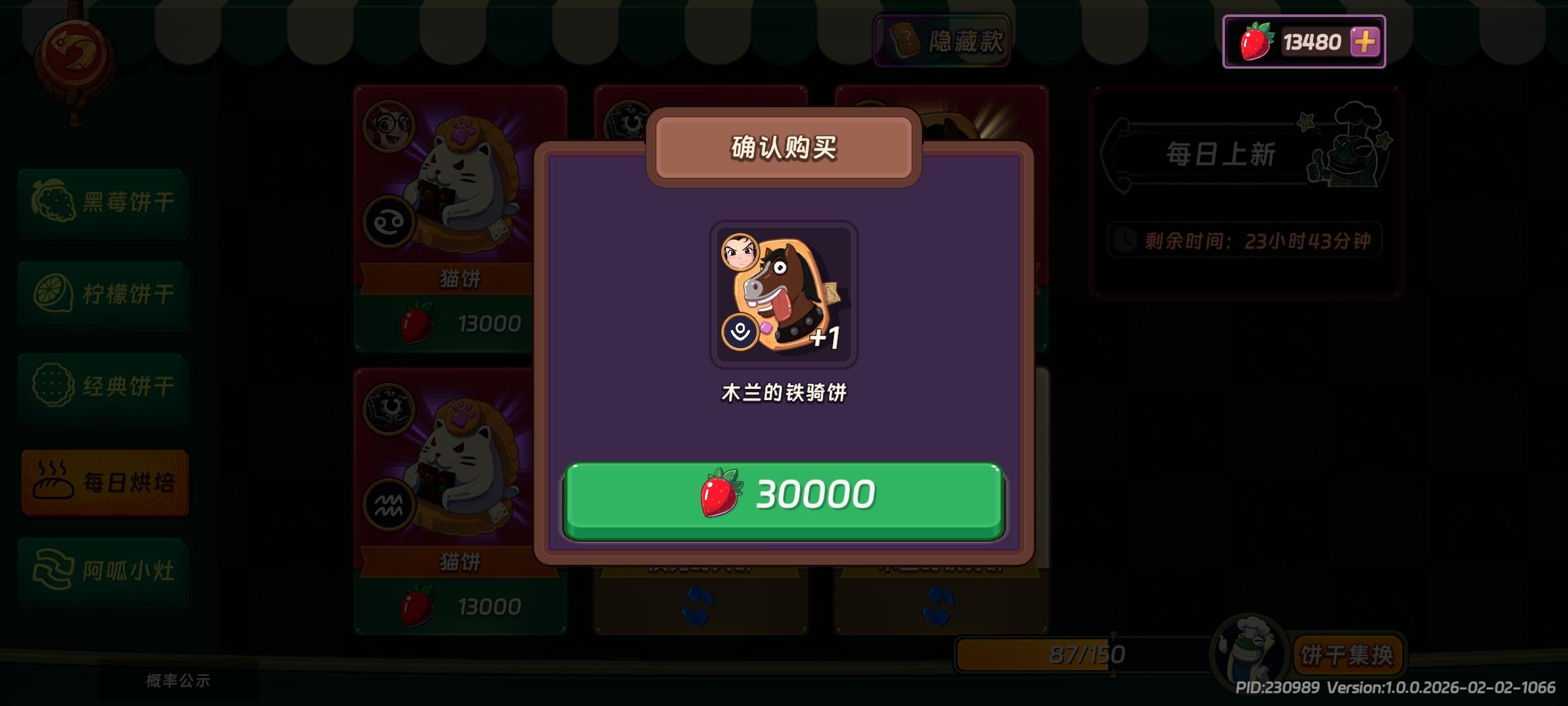 #汉克旅店 1.隐藏饼干强度除了赖师傅和小红帽镰刀都强。2.饼干兑换优先级一共有12种史诗饼干黑莓丶柠檬丶紫薯,这三种优先级是最高的。黑莓和柠檬除了柠檬花木兰有一定诟病,其他每日烘焙刷到就换。紫薯看个人除了重锤其他人的都是微微加强。3.每日商店兑换首先可以刷到花木兰的马,其次遇到隐藏必买。30000隐藏15000黑莓13000柠檬其他史诗都是13000。比较特殊的是这个紫薯