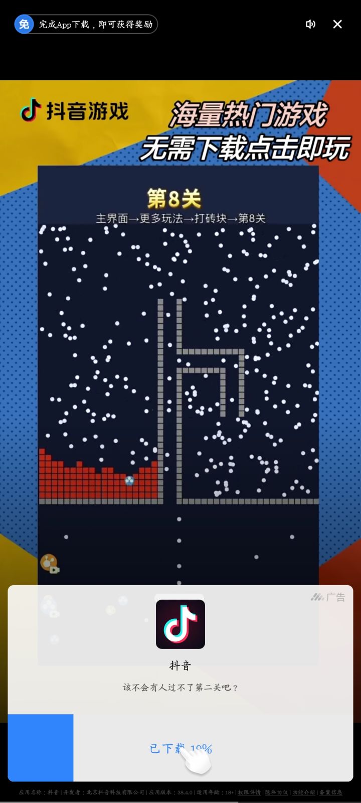 强制下载,关闭后每次点广告,都弹出这个抖音广告。可把我恶心坏了。不用抖音的人,再怎么推广告也是不会用的