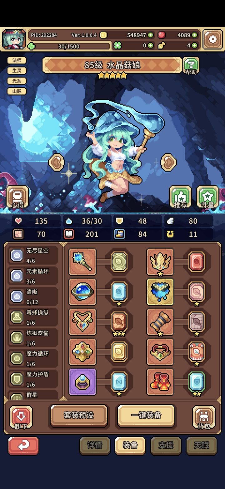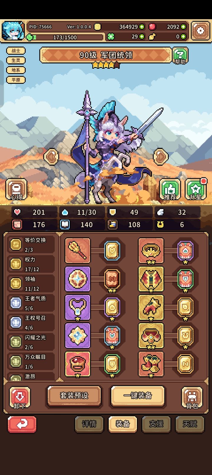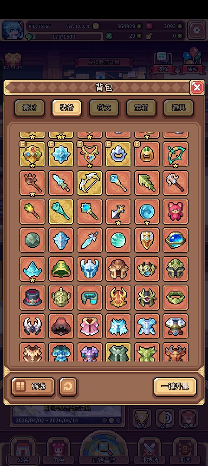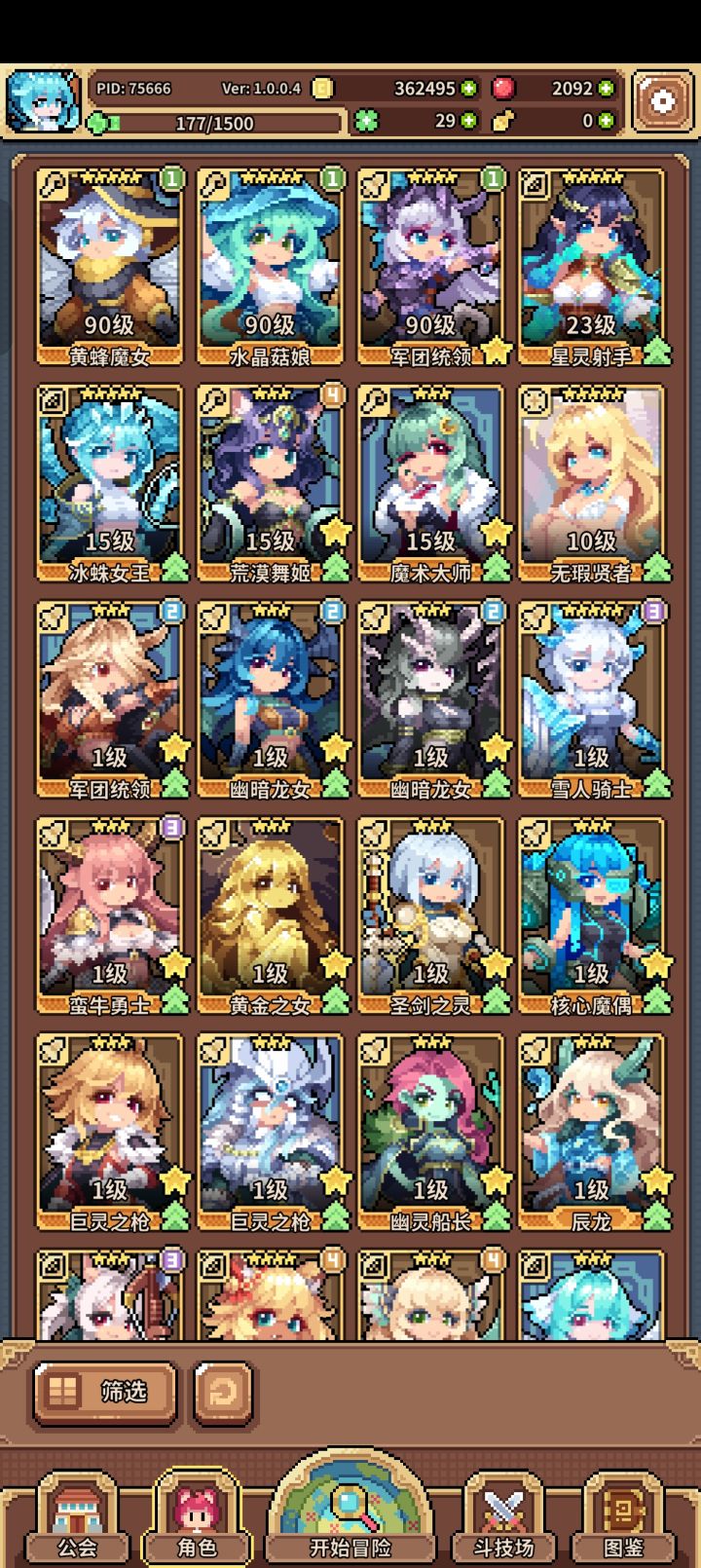 目前已有角色如上。普通碎片有900 异化碎片有200攻略里说的比较多的天赋只有一个招财的专属 兔子只洗出来了金色的穿透 天赋果只有36个了装备方面权力套和幸运套基本满了 兑换商店的积分能换五件冰系的金装现在图全开了但是大多数卡在深渊10少部分只能打到110级 挑战赛卡6巅峰赛基本动不了。