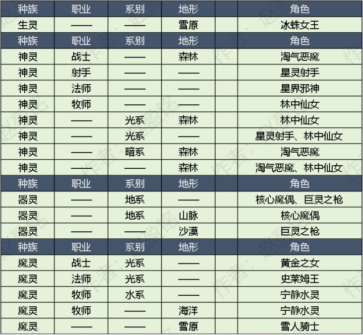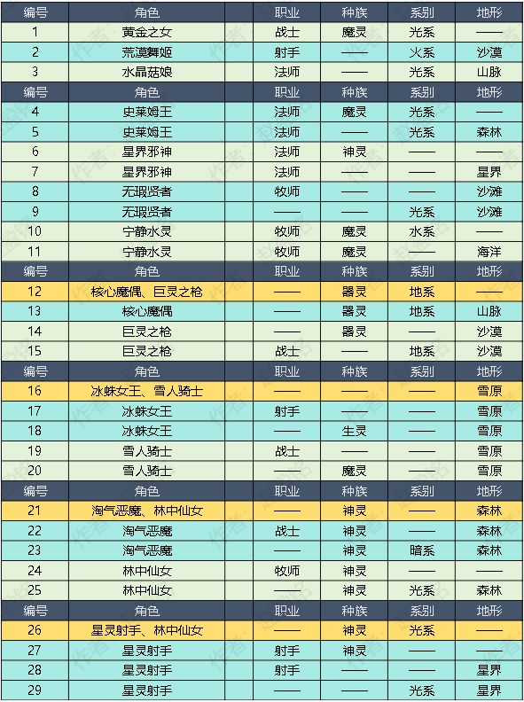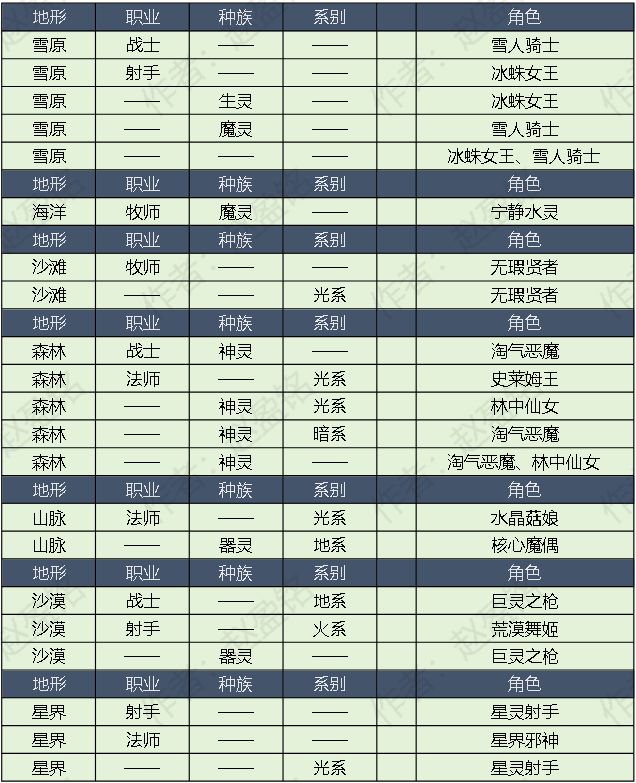 可以通过帖子内的筛选表格验证这些组合。 更新时间:2026/04/08 - 新增4张分别以职业、种族、系别、地形为首选项排列的组合表。