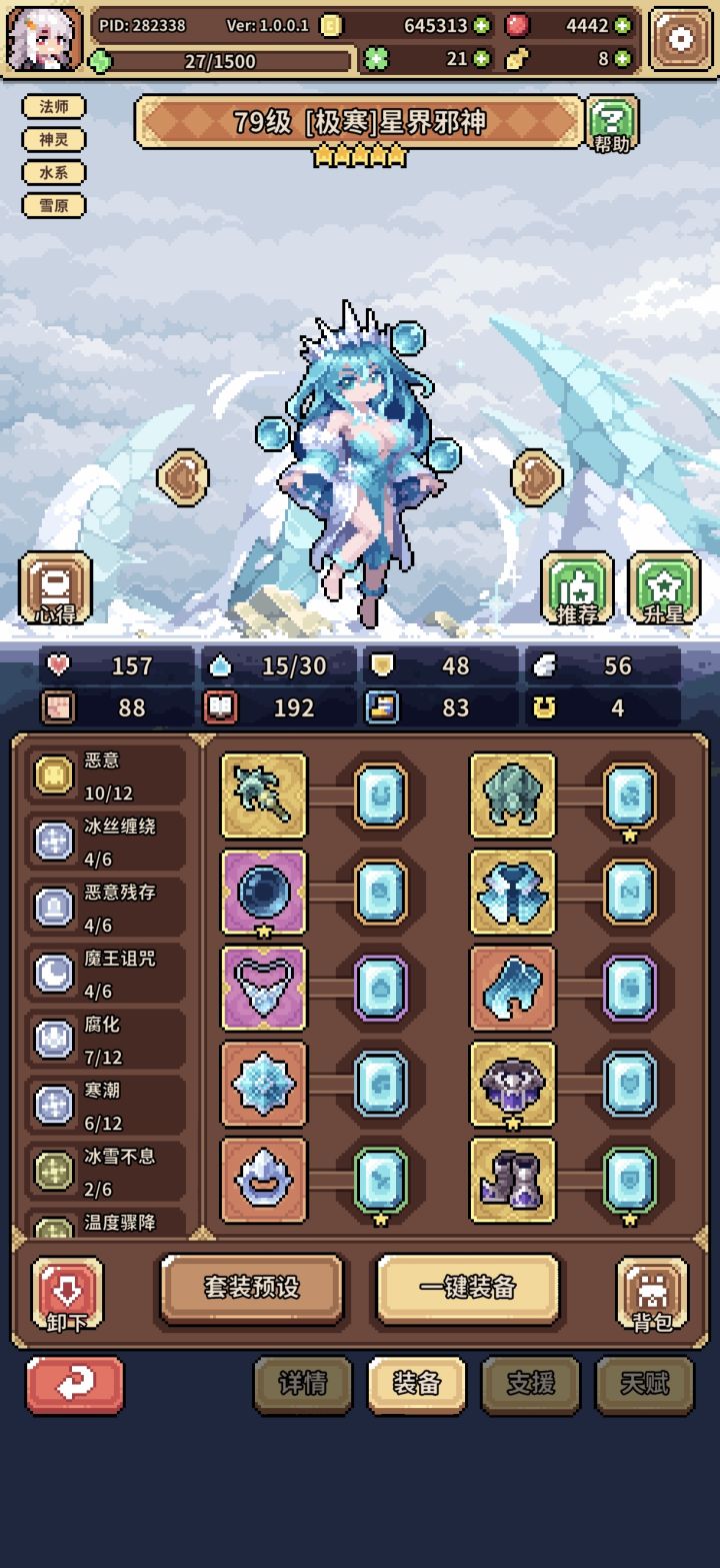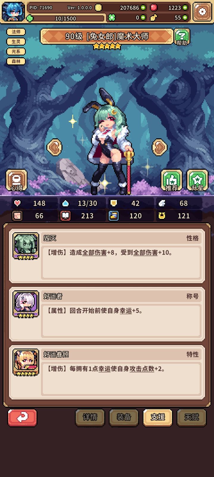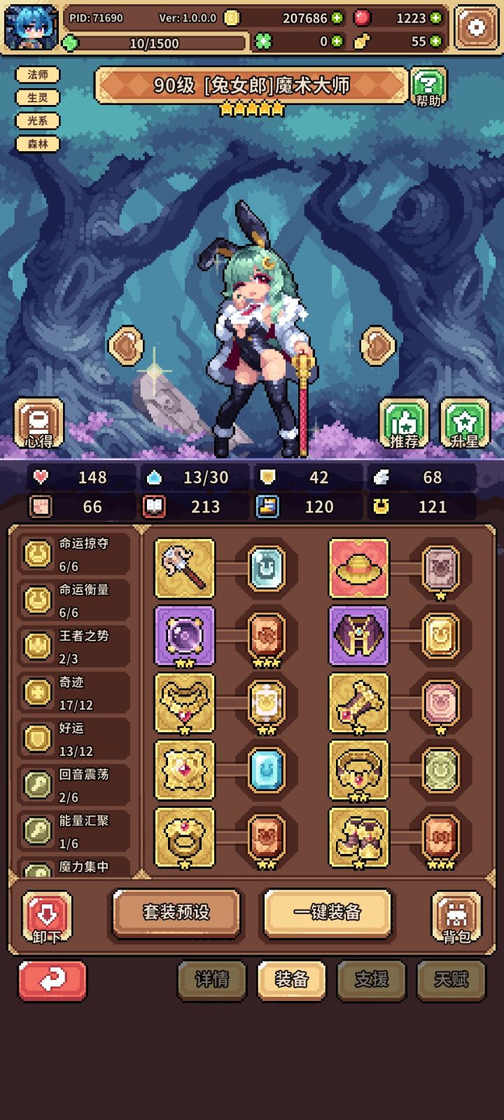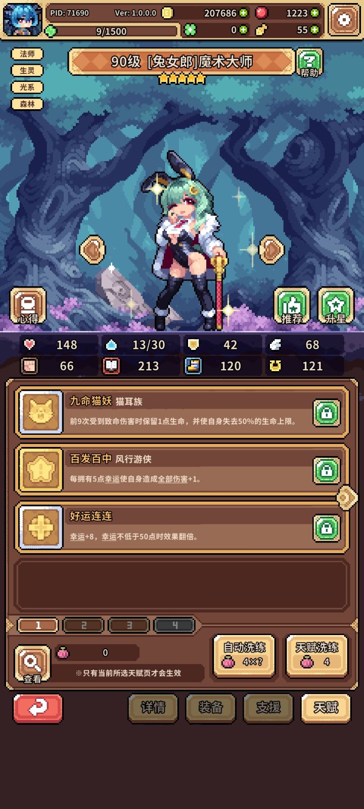 如图,一开始冰蜂流,总感觉乏力,索性小氪月卡买果子,洗九命猫开始转幸运,兔子是异化池200抽自选,花了一天时间凑的装备,然后200-300果子洗的天赋,两外两个角色都是捡破烂的配置,照样可以越二三十级推图,而且结算基本都在十点以上,花一两个叶子就够20,个人感觉比冰蜂舒服多了