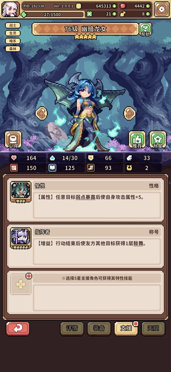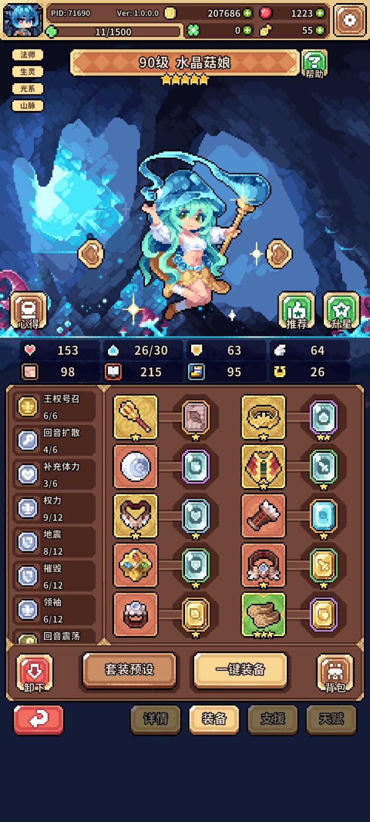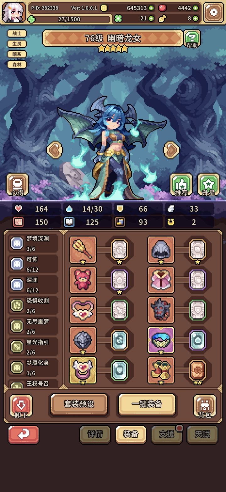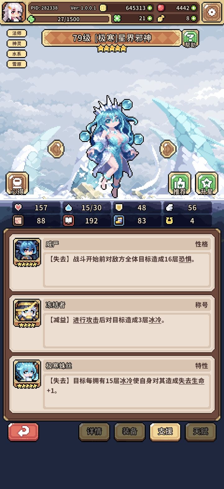 如图,一开始冰蜂流,总感觉乏力,索性小氪月卡买果子,洗九命猫开始转幸运,兔子是异化池200抽自选,花了一天时间凑的装备,然后200-300果子洗的天赋,两外两个角色都是捡破烂的配置,照样可以越二三十级推图,而且结算基本都在十点以上,花一两个叶子就够20,个人感觉比冰蜂舒服多了
