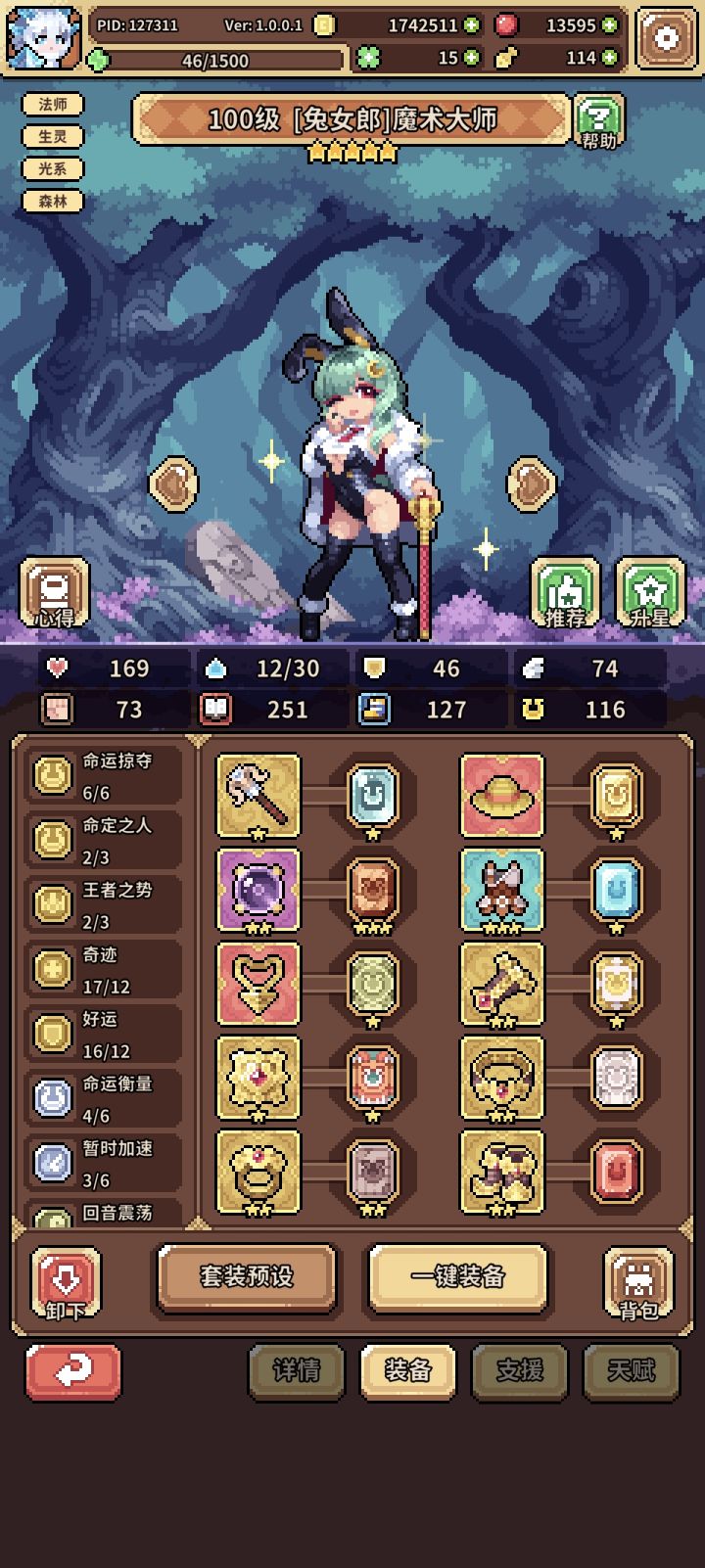 兔子队伍人马-蘑菇-兔子魔法师,人马蘑菇的装备天赋就不介绍了,论坛里都有攻略(人马不能升5,后期可刷招财专属天赋实现单拉,论坛搜招财能找到攻略,但是要求比较高不适合白嫖和微氪,前期用蘑菇和人马拉条造价比较低;人马如果升了5,蘑菇就带人马5星天赋,兔子法师带蓝色疾行皮夹,这样顺序就对了)蘑菇和人马装备天赋我没洗好就不展示了,其他攻略都能搜到,简单介绍下兔子魔法师的装备及支援和天赋装备:兔子魔法师前