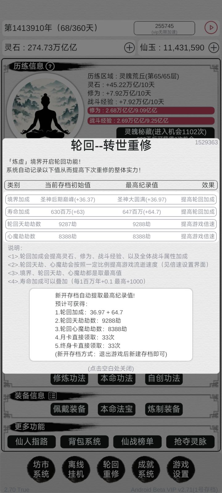 昨天入坑,玩着挺上头的,目前0转第一世。游戏很不错,就是心魔阶每次都要一关一关的点,前期还好,后期好几百关呢,手指头都点累了,太麻烦了。建议像这种很多关的,出个快捷挑战,跳过挑战,一健挑战之类的。就因为这个心魔劫搞得好几次都想删游戏。