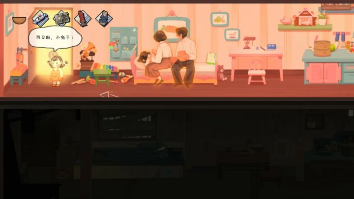 游戏采取上下层的房间设计,以展现两种不同的场景风格。上层的房间描绘了一个家庭幸福的场景,墙上挂满了奖状,房间整洁干净,充满温馨的氛围,仿佛是一个童话般的梦幻世界。