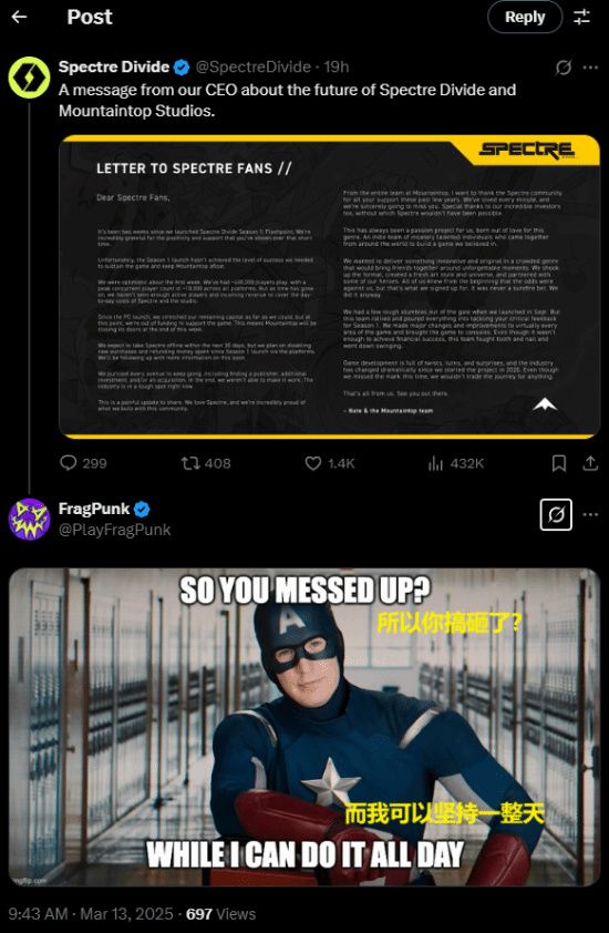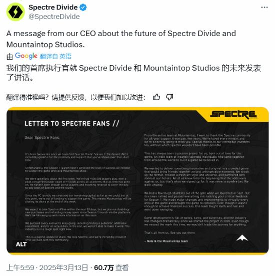本周早些时候,开发商 Mountaintop Studios 宣布,因为能在对应市场吸引到足够多的玩家,故将在未来 30 天内关闭其处女作《Spectre:Divide》 :该游戏首发仅6个月,总体玩法类似于《CS:GO》与《无畏契约》。这是一个不幸的公告,因为这意味着一些人喜欢的游戏被关闭,而 Mountaintop 的每个人都失去了工作,再次被推入一个动荡和过度拥挤的就业市场。然而,近日爆