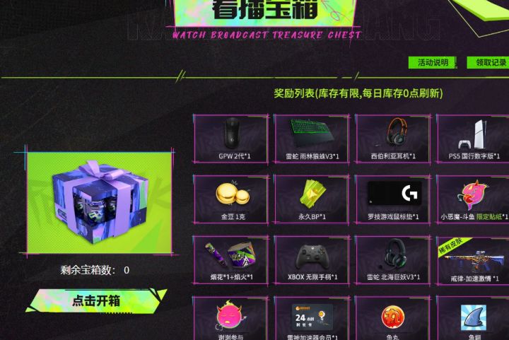 外面车模,里面就是大司马和茄子,这两个FPS界的活宝。今天茄子这里可以抽到官方给的外设和游戏通行证,另外某鱼的专题任务可以领每日箱子。最次的是24小时的加速器,烟花焰火等等,还有就是皮肤,限定贴纸,还有外设等等。这个箱子今天概率高,全是24加速或者烟花