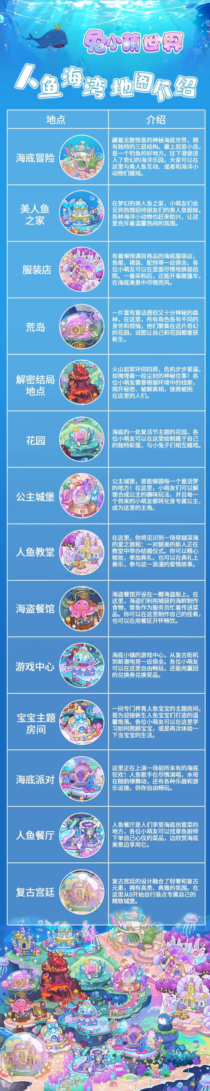 小提示:现在加入官群,还能领取分红噢~亲爱的小萌友们:奇幻地图将在1月29日和大家见面~一、大地图可进行昼夜切换三个地图,都能进行白天、黄昏、黑夜的状态切换~二、14个建筑等待大家光临古堡客厅:海底世界的公主城堡房间,是为圆孩子们童话梦而生的梦幻角落。建筑师受经典童话启发,将城堡阁楼改造得精致又温暖。美人鱼教堂:一场穿越深海的爱之旅程当陆地的钟声化为海底的气泡,一场独一无二的人鱼
