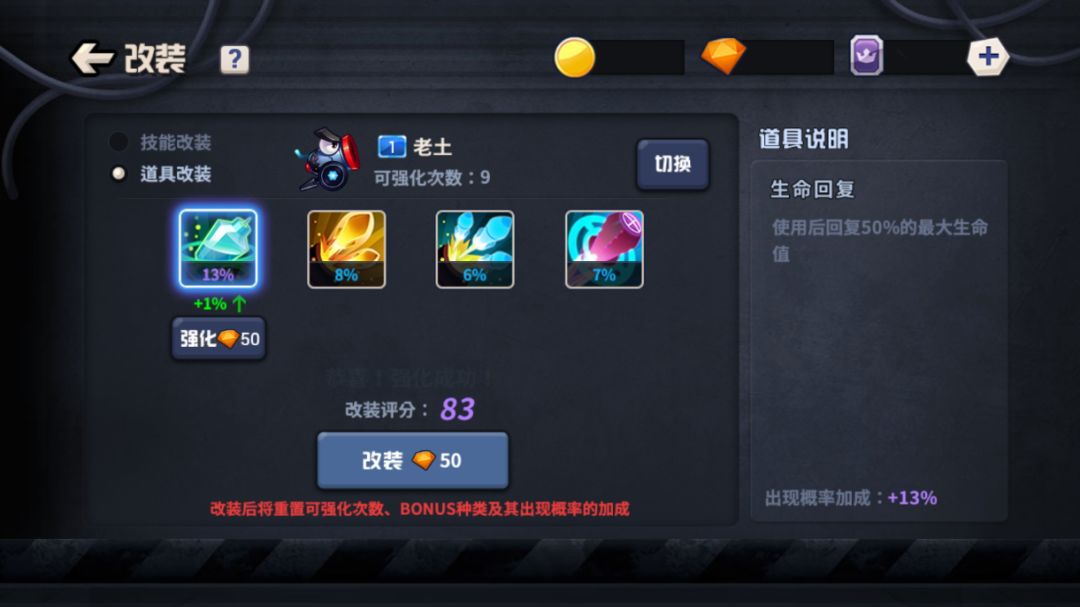 1.道具改装分为改装和强化两种方式。12级开启道具改装 2.改装,需消耗一定数量钻石,从全部BONUS中随机选择4个,并随机给予一个出现概率的加成。再次行动无法进行改装 3.强化,需要消耗一定数量钻石及1强化次数,有一定几率为指定BONUS出现概率增加1 %的加成 4.改装会重置强化次数、改装BONUS的种类及其出现概率的加成 5. BONUS改装概率的加成上限为20%。每个坦克的道具改装相互独立