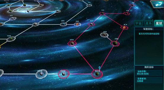 通过星图界面,可以在各个星球之间移动,每个星球与星球之间都有着固定的航道。只有已经占领或势力范围内的航道才可以进行航行,占领星球可以获取大量资源,每个种族的母星不可被占领。进入占领的星球,可以进行探索、查看星球信息、星球建设、星港布防、训练守军、星球管理等操作,同时也能指定执政官等获取星球的控制权,成为该星球的所有者。星球信息,详细公布了星球的各类信息,包含该星球的管理信息、星球大小、探索情况
