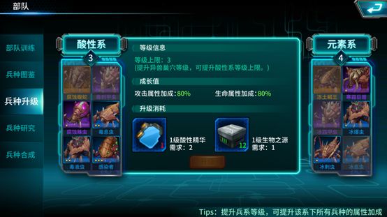 升级基地内兵种基地,收集对应的兵系素材后,可以在兵种升级界面,对该兵系进行升级,升级兵系可以大幅该兵系下的兵种强度。