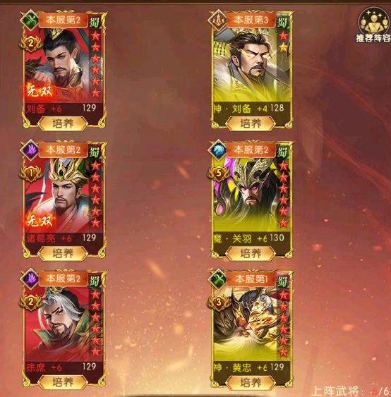 阵容推荐: 武将:神,刘备+魔.关羽+神.黄忠+刘备+诸葛亮+徐庶 阵容思路:蜀国的阵容特性是,兼具爆发、控制、续航与战术灵活性为核心特点,武将技能紧密围绕连击特性展开联动,在三赛季可以上六个武将的情况下,神魔武将阵容也逐渐成型,阵容的搭配也就更加完善。核心优势在与双刘备叠加增益双刘备同时上场大幅提升全队防御和回复能力,形成"不死流"阵容基础,神刘备的天命技能吸收敌方兵力上限转化为护盾,并提升队友