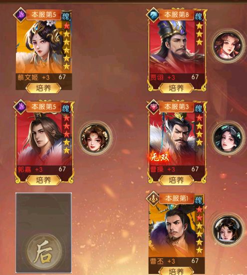 前期阵容推荐:武将——郭嘉+曹操+曹丕+蔡文姬+贾诩 阵容思路:魏国的特性是对敌方施加中毒效果来达成伤害最大化和防御能力。贾诩是一个核心放毒武将,在魏国阵营里面是一个不可或缺的存在,而曹丕则是辅助贾诩进行放毒,施加放毒频率,达到对敌方全体造成中毒效果。郭嘉作为魏国的核心输出,有着独特的吸收敌方怒气为己用的技能效果,可以不断的释放技能,并且对中毒的武将可以造成额外伤害,有着很高的上限和培养空间。