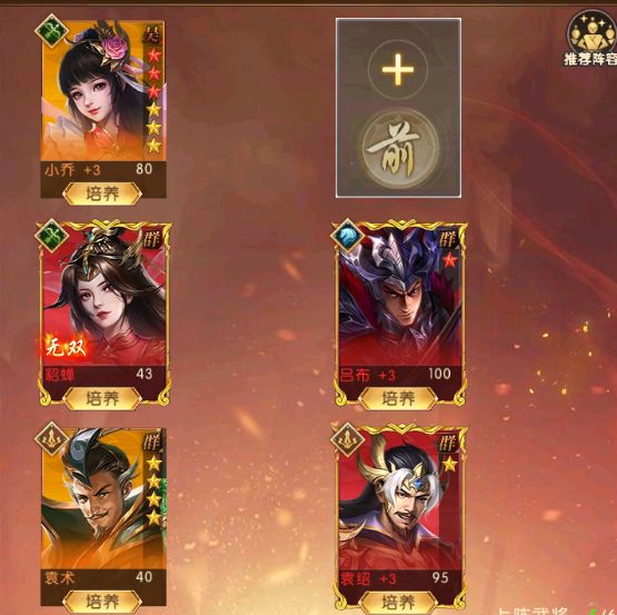 武将:吕布,貂蝉,袁绍,小乔,袁术群雄阵容特点:具有独特的流血效果和强大的输出能力达到伤害的最大化。群雄的显著特点是角色技能多能对敌方造成流血效果,并且针对处于流血状态的敌人,群雄武将可造成额外增伤,随着战斗推进,流血伤害不断叠加,能给敌方带来持续且高额的伤害输出。袁绍是作为吕布伤害不可缺一的武将,可以为敌方施加流血效果配合吕布的增伤,来达到最大输出化。貂蝉可以为吕布提供增益的效果以及干扰敌方行