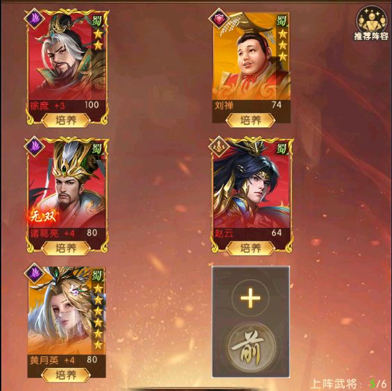 前期阵容推荐:武将——徐庶+赵云+诸葛亮+刘禅+黄月英阵容思路:蜀国阵营以连击输出和快速爆发为核心特点,武将技能紧密围绕连击特性展开联动。徐庶是蜀国的辅助连击核心在蜀国阵营里面是一个不可或缺的存在同时徐庶可与诸葛亮、赵云搭配,组成蜀国冻结队。诸葛亮负责控场,赵云作主c输出,徐庶则充当连击触发器,为赵云等蜀国武将触发连击效果,配合诸葛亮的冻结控制,让赵云能在安全环境下叠加龙胆,打出高额伤害,刘禅在