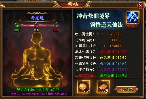 各位《远古传奇》的勇士们,今天给大家介绍的是游戏内的修仙功能修仙也是游戏内一个不可多得提升战力的系统1、提高修仙境界可以提升大量的属性以及增伤2、对境界低的玩家还可以进行压制打出额外伤害3.、每修炼一个境界到圆满可额外增加50%的属性,到元婴可习得神技”分身术“4、境界越高能进入的倍率高爆图越高,获取的装备更好5、缺少上古灵石可找万事通利用其他材料合成欢迎各位勇士可以加入福利群一起分