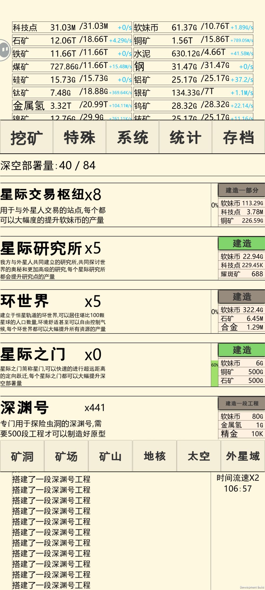 想到第六段外星域,得修另一个飞船去木星,然后研究木星科技,但想完整过第六段,必须得有聪明的大脑,研究条件是500重生50四维,不然你的科技点到不了后面的需求,卡住了就得重开,浪费时间,等你满足条件有了聪明的大脑后,可以勉强肝到后期,然后就是漫长的修奇迹过程[表情_喷]#重生挖矿 #攻略