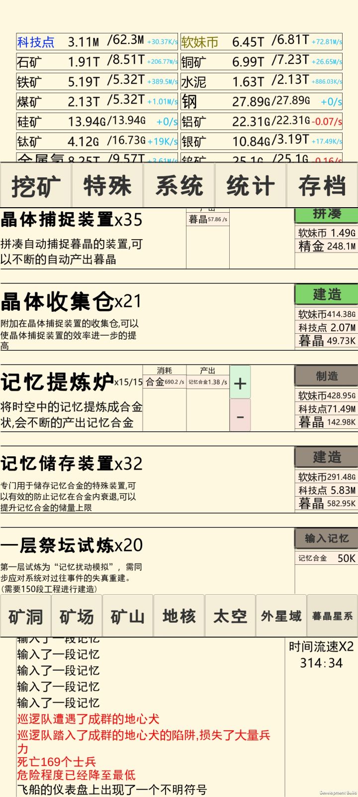 无寺庙、战力不够打传送门、工程还差301段、没钱没科技、什么叫“我的合金工厂和秘银工厂不能全开”(55只能开26不然钛铝银倒减)目前的选择是一肝到底硬造到外域片并且寺庙还要等5天二是凑战力打传送门开2周目完成1周目外域伟目所以给一个建议鸡险2选1