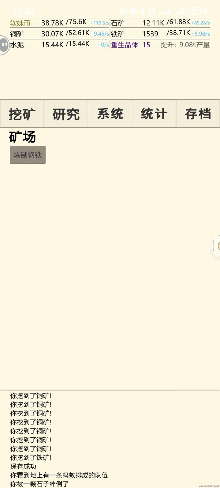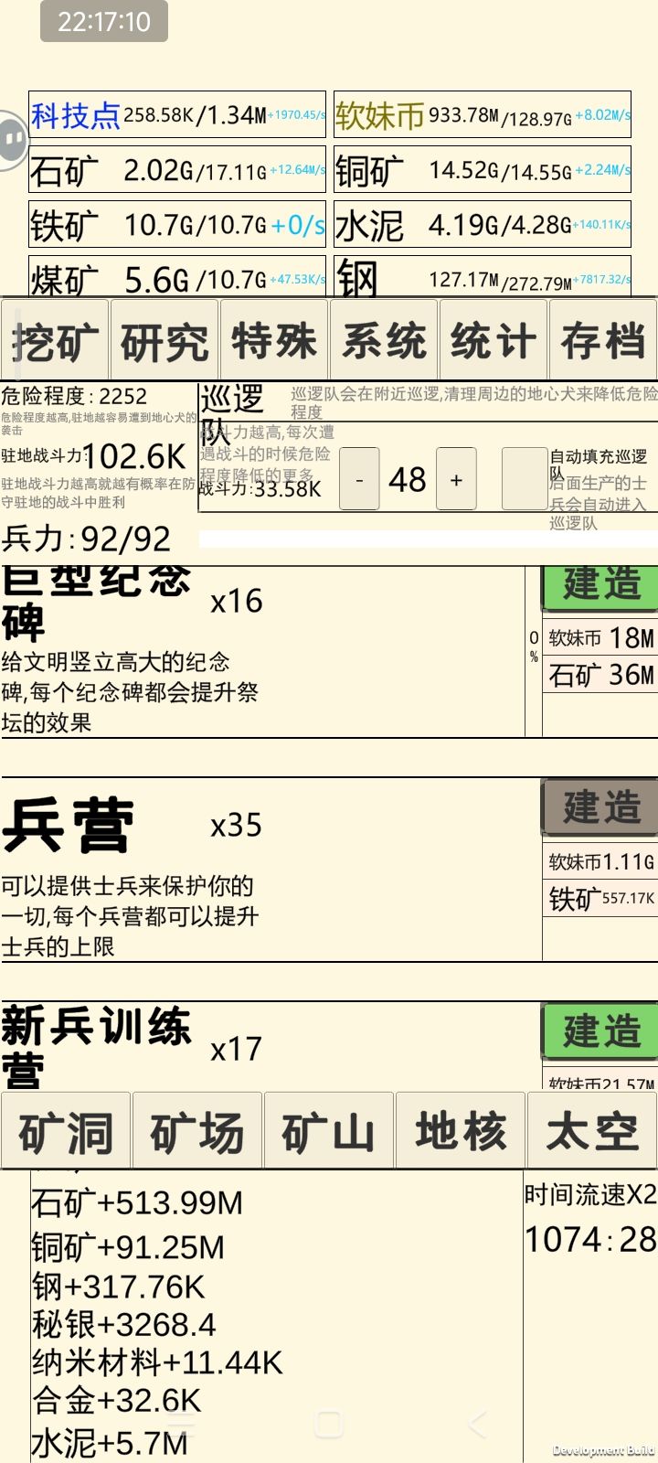 看广告一定要点击跳转,现版本跳转收益非常高矿洞阶段科技点满就行,矿山阶段点出钢后,钢点3到4级就行,科技顺序先点工业储备站,之后保证自己的软妹币上限在100k如果不够100k可以点几个加软妹币上限的科技,等有100k上限后,点出科技银行,银行等级10就行,然后点五险一金,投资,利息,点出这几个科技后软妹币产量大增,保证铁矿不负的前提下可以多点几级钢,之后点出钻头,挖掘机,硅矿挖掘,手持电钻,互联