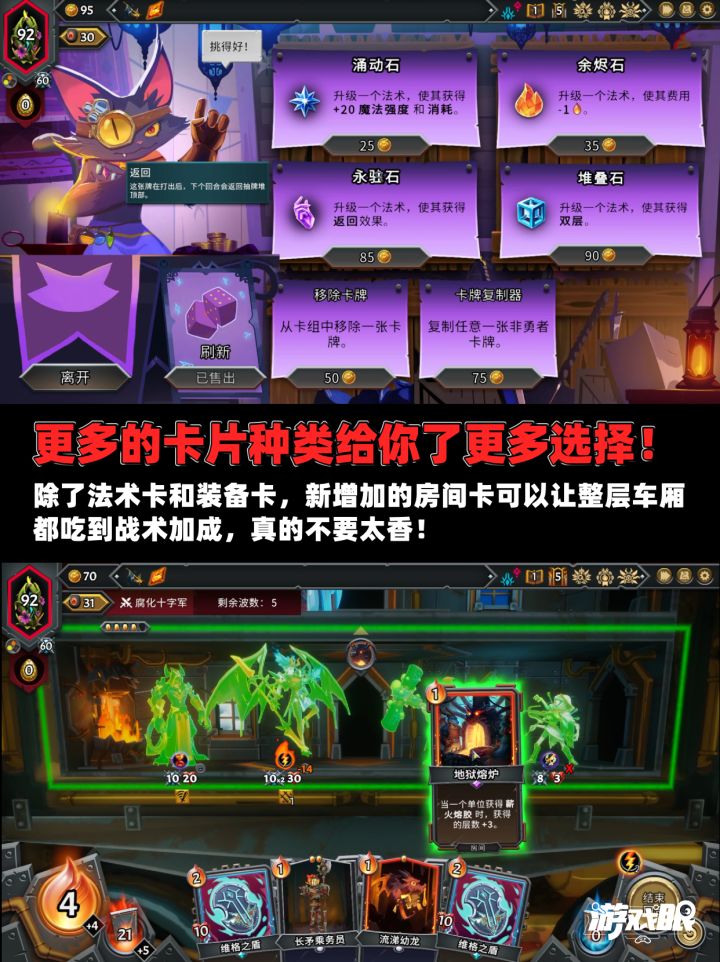 1、具有独创性与策略深度的玩法,本作简言之是一款强调多单位多战线协同的肉鸽卡牌构筑游戏,二代基础玩法设计上基本继承了一代的特色,需要在三层的火车空间里部署和强化怪物单位,同时利用各种法术卡和单位本身的特性来削弱敌人或辅助己方,目标是阻止敌人抵达并攻击火车顶层的薪火。对比其他尖塔Like,这种独特的垂直战斗设计,让游戏明显延伸出了战线控制的策略乐趣,比如你可以选择把带有成长性的单位放到最上层,让他们在面对敌人前获得充分的成长。