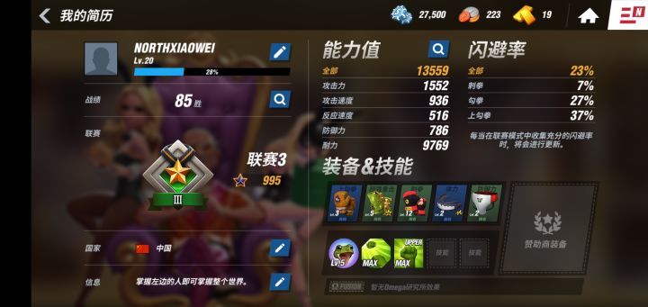 隨便寫的不全玩了一周,聯賽四,劇情五(不夠看),裝備一高四稀,其中兩個十級其他一級,技能聯賽四的技能點還沒用完(官方限制速度)建議一開始金幣攢著開多兩個技能,中後期很有用,戰術選擇更多。我手欠,以為金幣好多,秒花一百,開了個高檔頭套,沒什麼用就是騷,被打暈都看不到臉。技能形形色色,聯賽三後期到四,一千星以上,基本中級姿勢加一個中級拳術。我是一開始對比還擊發現踉蹌攻擊更高選了踉蹌。初級都