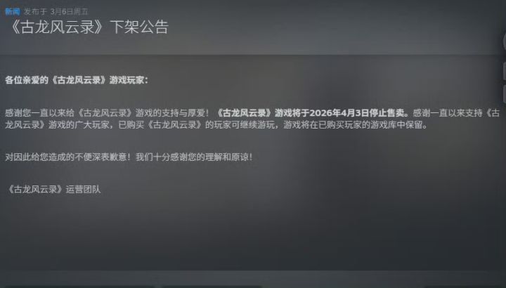 【快讯】古龙风云录即将全平台停止售卖