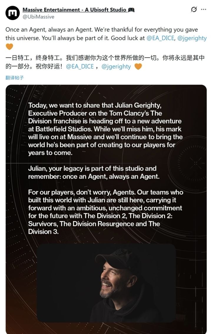 1月17日消息,《汤姆克兰西:全境封锁》系列执行制作人Julian Gerighty已正式从所属工作室离职,这位在该团队深耕27年的行业老兵,将开启职业生涯新征程。Julian Gerighty自1999年加入团队后,逐步成长为核心创作力量,不仅联合执导了《全境封锁》《全境封锁2》两款现象级作品,奠定系列开放世界射击游戏的标杆地位,还在2023年晋升为系列执行制作人,统筹包括新作《全境封锁3》、