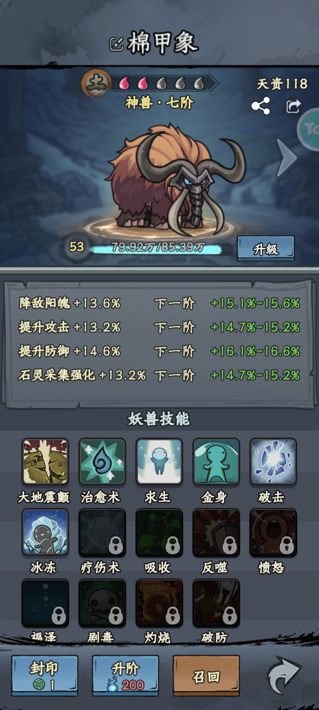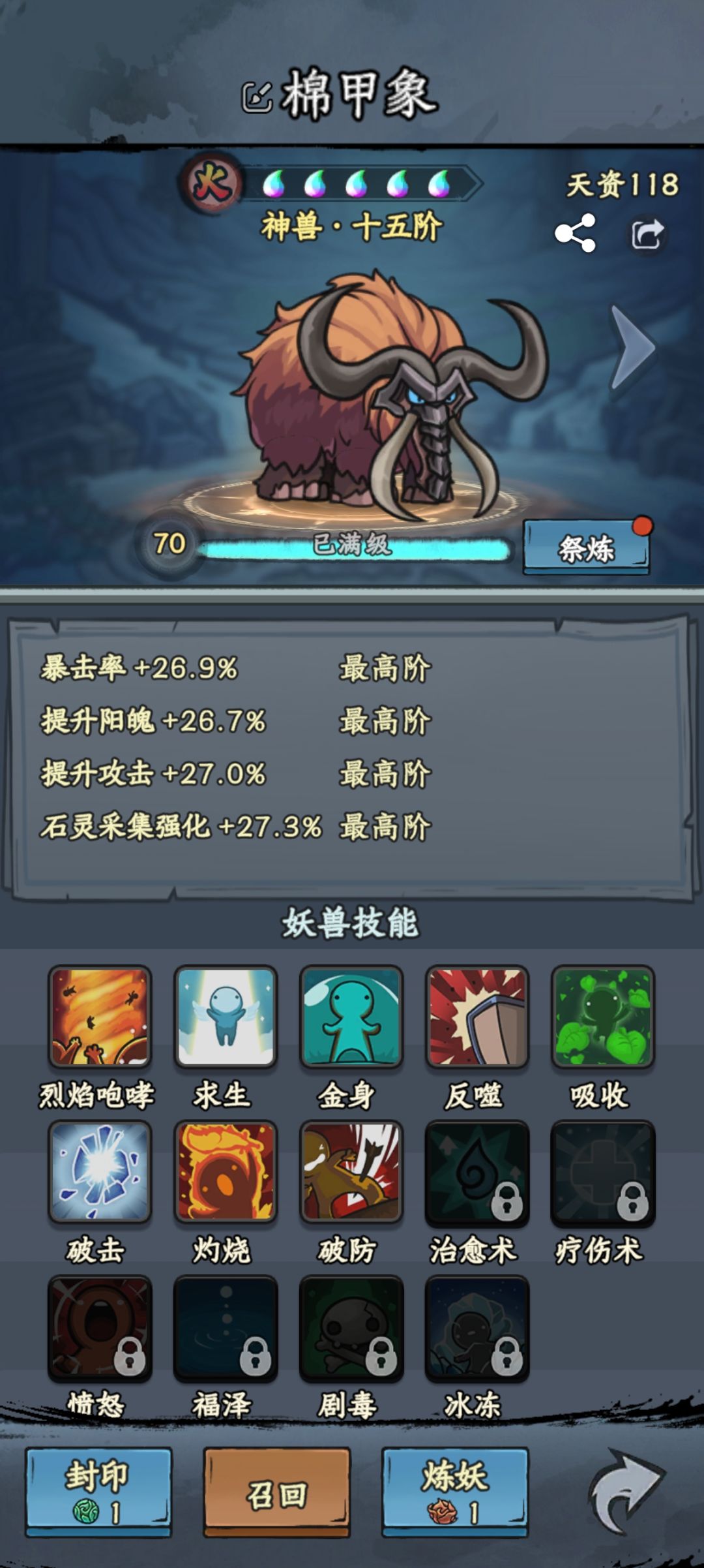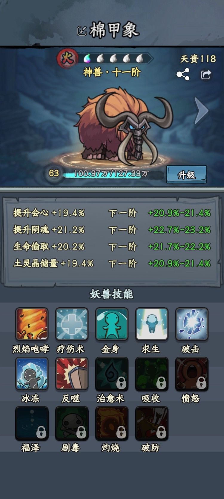 晒妖兽/ 棉甲象/挂机神宠 UID:20174139 首先我觉得不管是词条,还是技能方面都很完美 技能有 |吸收 |可以大大降低收到的伤害, 必备技能 |治愈术| 可以在血量降低到一定程度的时候回一口,大概能回1/3血 |冰冻| 可以大大降低敌人的防御力,以及攻击速度 |灼烧| 可以每年灼烧敌人百分比血量, 打boss时也可以配合第三个阵法,从而达到1+1=3的效果 |破击| 这个可以破掉地方的
